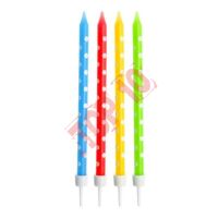 ŚWIECZKI W GROCHY KOLOROWE. Opakowanie zawiera 24 świeczki z nadrukiem w grochy. Kolory: żółty, czerwony, niebieski, zielony . Długość 10 cm. Szerokość: 0,5cm. Każda świeczka zawiera podstawkę.