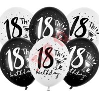 Balony Strong 18th! birthday z białym i czarnym pięciostronnym nadrukiem, mix kolorów (Pure White i Black), średnica 30 cm.