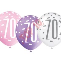BALONY UQ GLITZ Rozmiar balonów w calach: 12 Rozmiar balonów w centymetrach: ok. 30 cm Ilość sztuk w opakowaniu: 6 Kolor: różowy, fioletowy i biały Nadruk: liczba 70