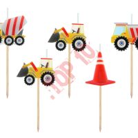 Świeczki na tort dla miłośnika aut budowlanych. Śliczny zestaw świeczek (pikerów) urodzinowych. Odpowiedniej długości, dobrze odpalające się knoty pozwolą na szybkie i łatwe odpalenie świeczek w tym samym czasie. Świeczki palą się wystarczająco długo, by móc cieszyć się urodzinowym świętowaniem, śpiewaniem „sto lat” a na końcu zdmuchiwaniem. Zamocowane na praktycznych patyczkach świeczki będą stabilnie stać i pięknie prezentować się na torcie, babeczkach, muffinkach i innych wypiekach.