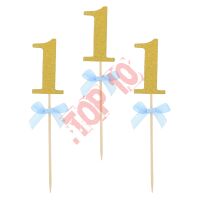 Pikery cyfry 1 do dekorowania babeczek i muffinek. Oprószone złotym brokatem cyferki pięknie mienią się w świetle, a niebieskie wstążeczki nadają im delikatności i słodyczy. To śliczna dekoracja na pierwsze urodziny chłopca, czyli innymi słowy roczek.